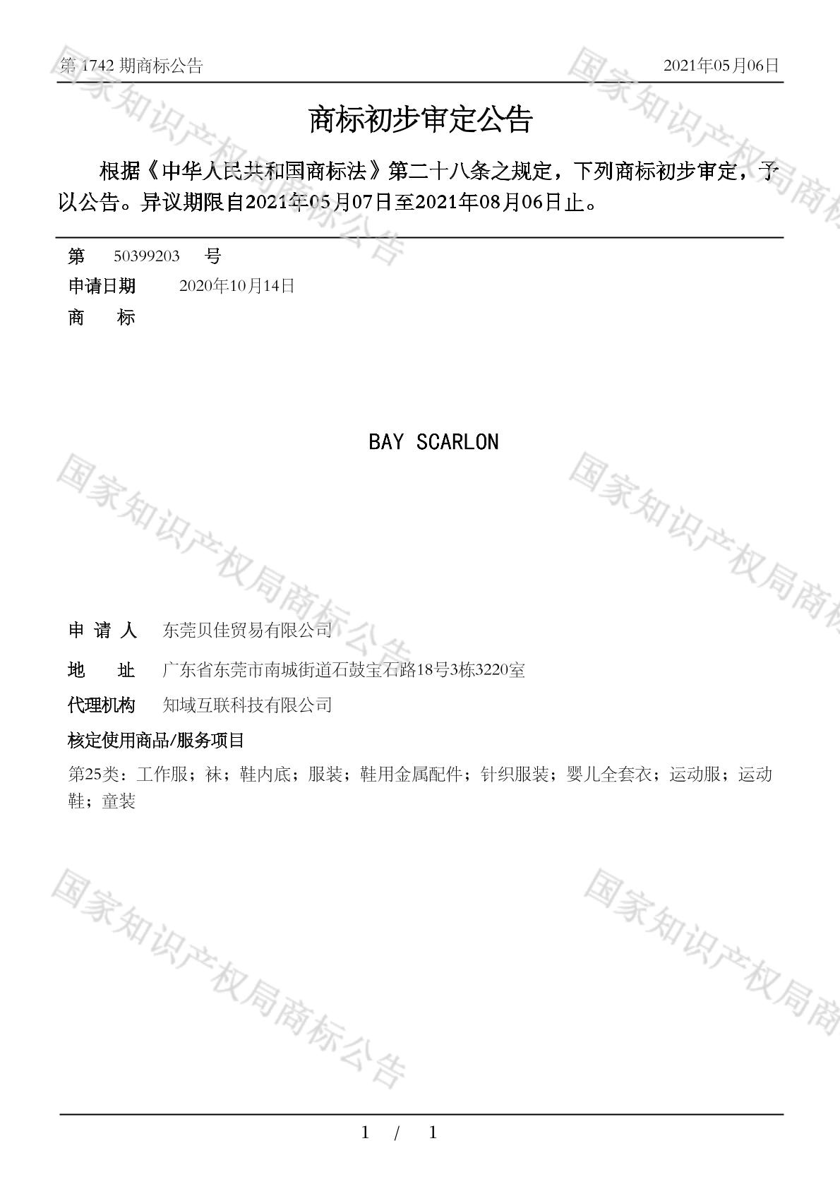 东莞贝佳生活用品有限公司25类商标成功通过初审